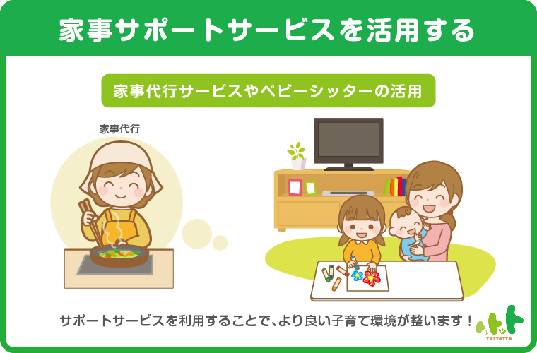 最近では、家事代行サービスやベビーシッターを気軽に利用する家庭が増えています。家事の一部をプロに任せることで、自分の時間を作り、子どもとゆっくり過ごすことができます。