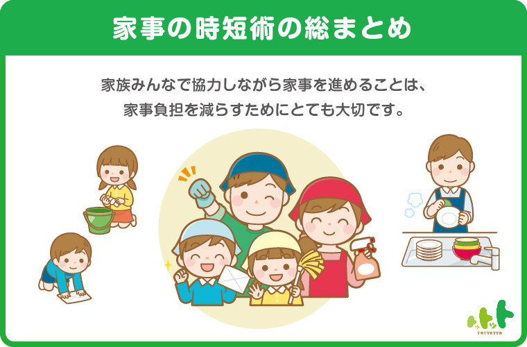 家族全員で協力することで、無理せず効率的に家事を進められます。みんなで力を合わせて、心地よい家庭を作っていきましょう!